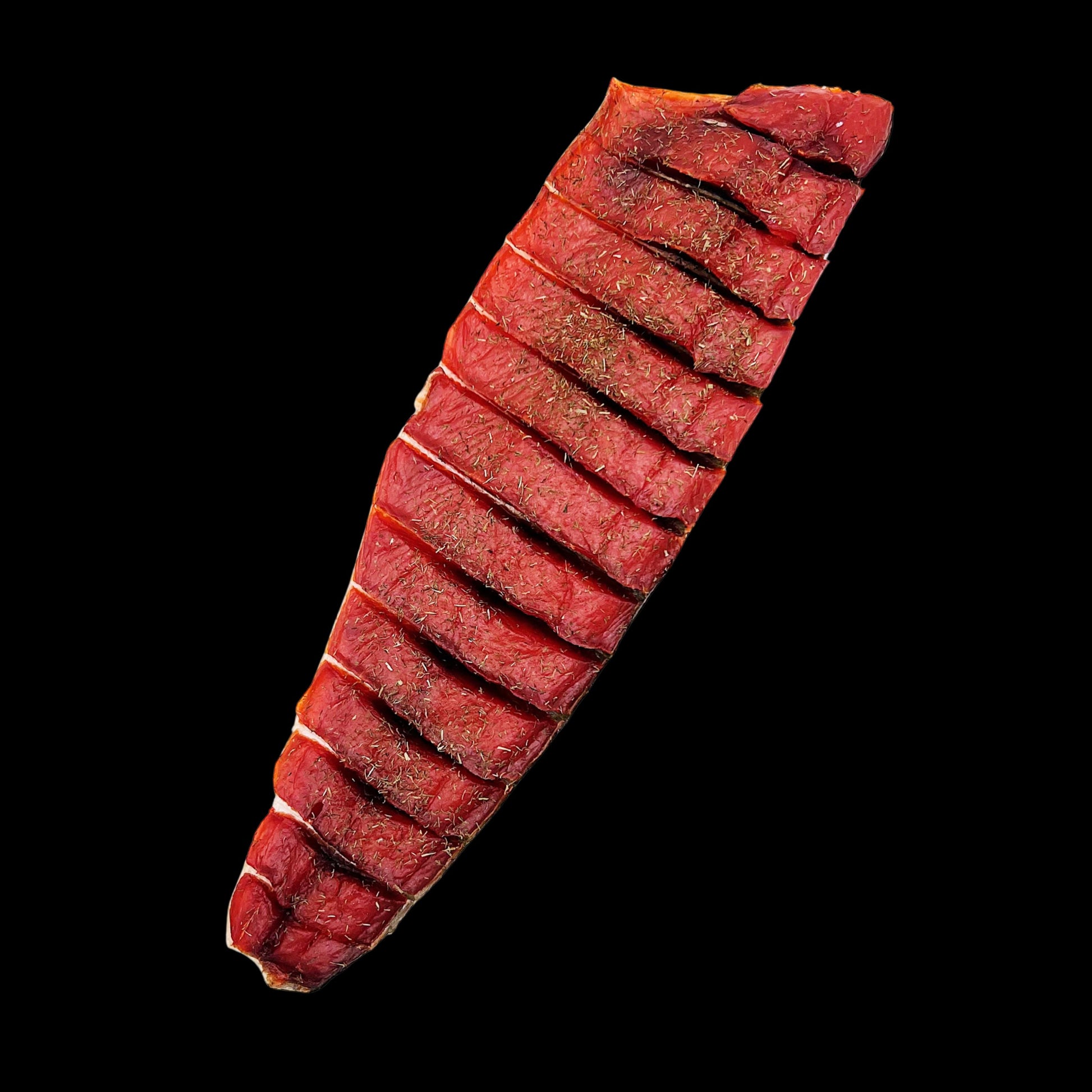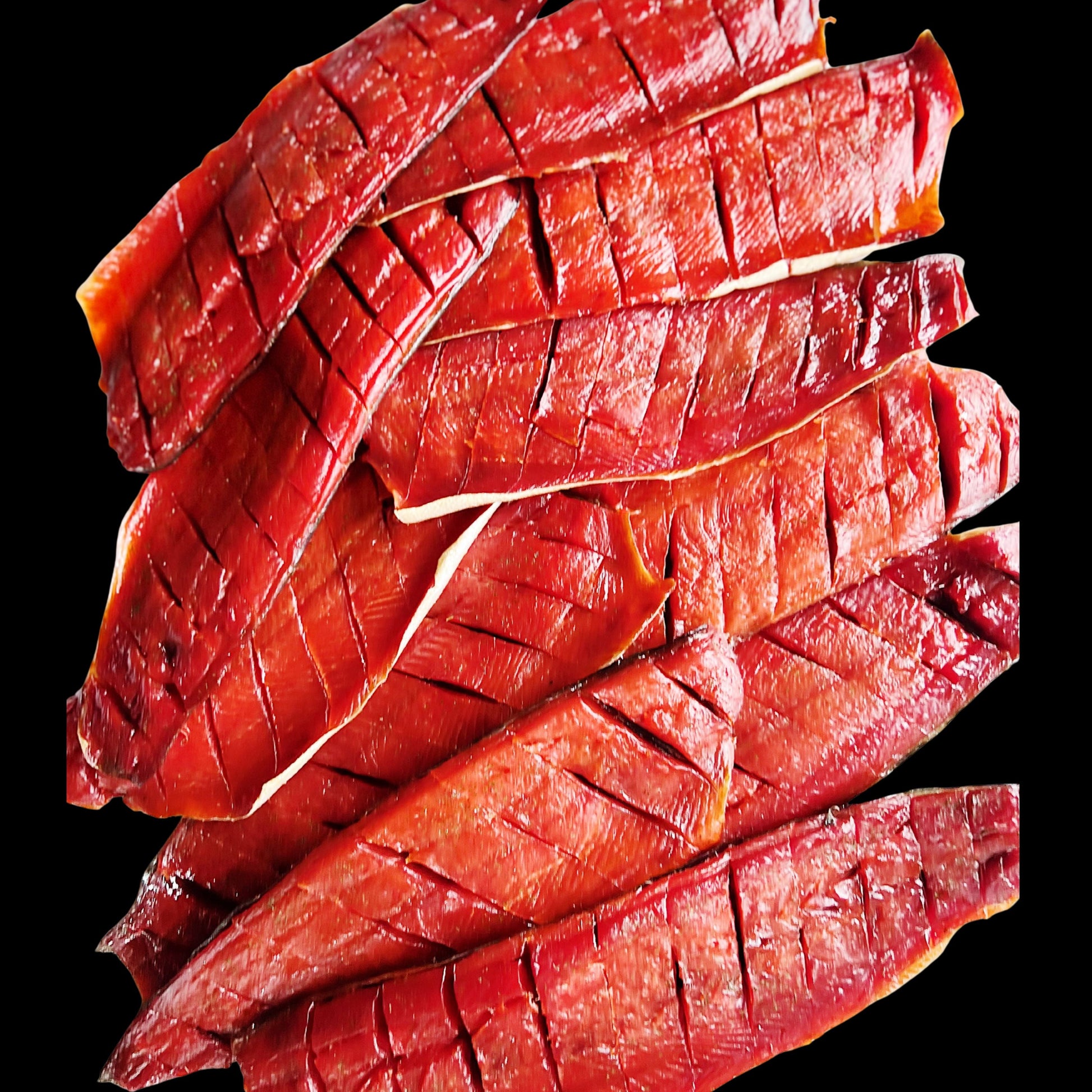 Our sockeye salmon is sustainably wild-caught, ensuring the purest flavor and quality from the start. Upon arrival, the fish is flash-frozen to eliminate any potential impurities, preserving its integrity. We then carefully cure, air-dry, and smoke it using time-honored techniques that unlock its deep, savory character.