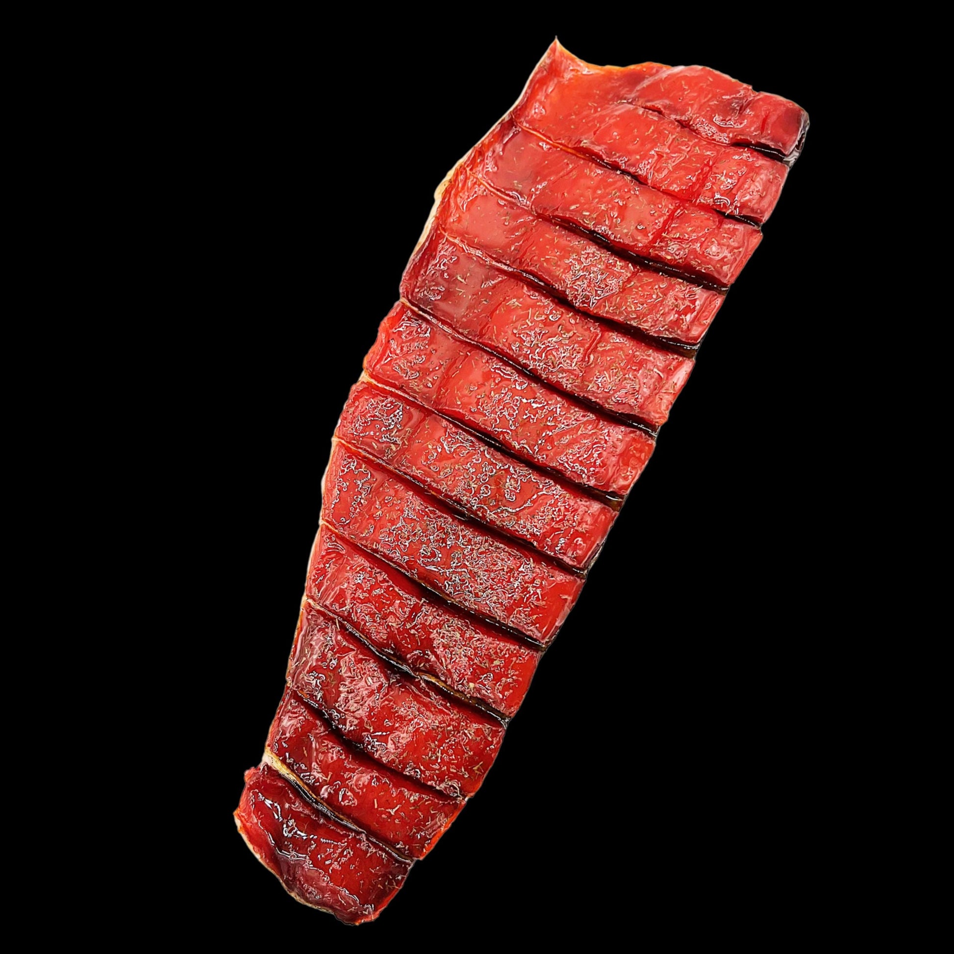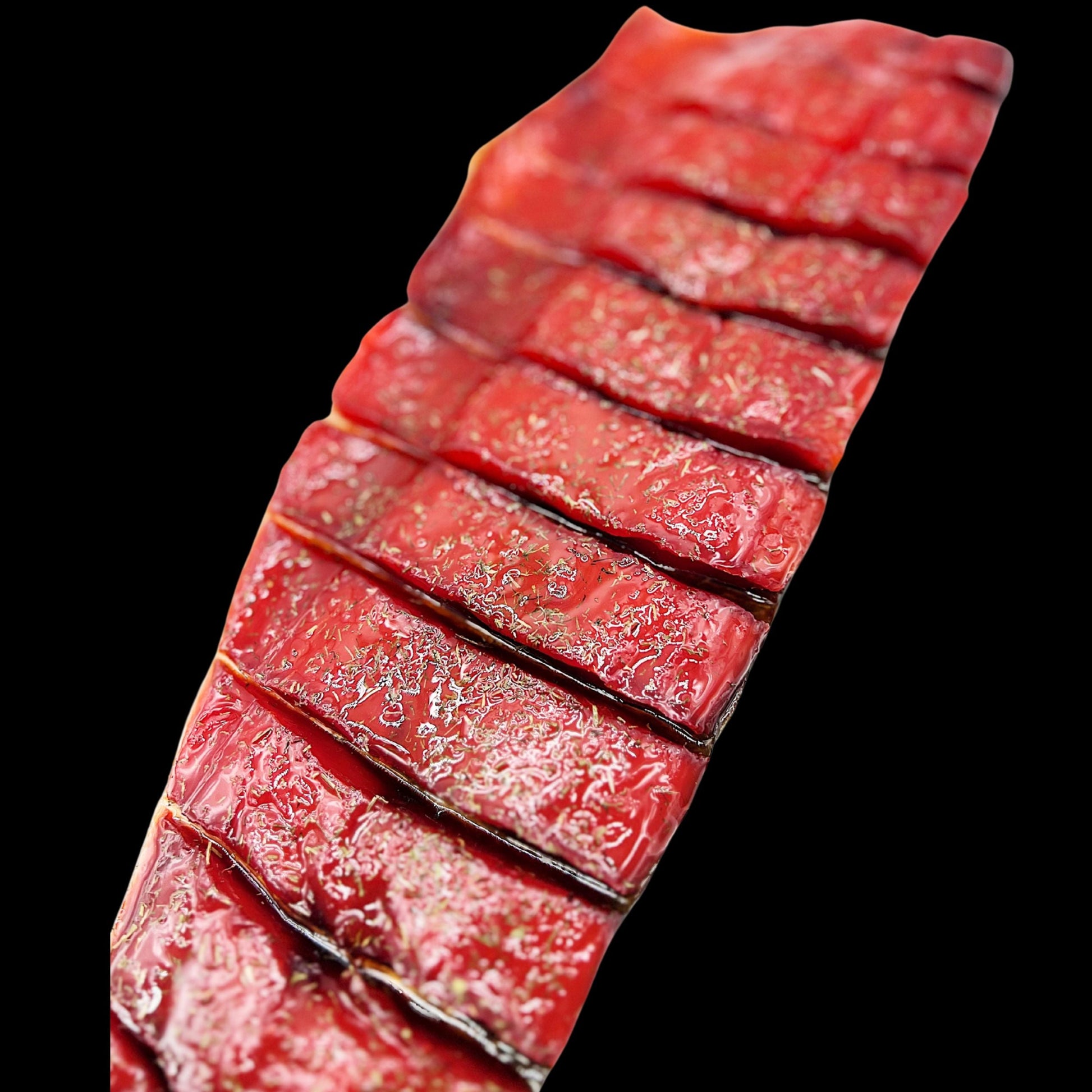 Our sockeye salmon is sustainably wild-caught, ensuring the purest flavor and quality from the start. Upon arrival, the fish is flash-frozen to eliminate any potential impurities, preserving its integrity. We then carefully cure, air-dry, and smoke it using time-honored techniques that unlock its deep, savory character.