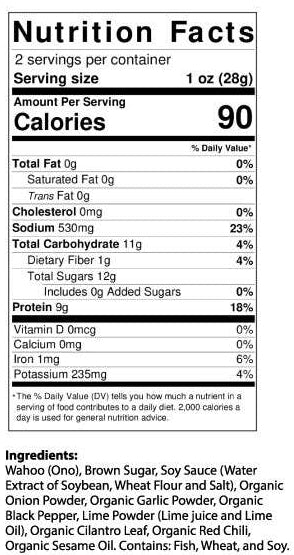Wahoo is also known as Ono in Hawaii. Ono is a delicious white fish meat prized by Hawaiians and seafood enthusiasts. Classic goodness - you can't beat the delicious zesty and umami taste of our island citrus flavor wahoo. Our jerky is proudly made in hawaii with no artificial preservatives or nitrates. Fresh from the ocean - our wahoo jerky is made from wild-caught wahoo, containing more minerals such as potassium, zinc, and iron, but fewer calories. It's also made with organic ingredients. Protein-packed - with 25 grams of protein per bag. A better way to snack - our wahoo jerky is low in sugar, carbohydrates, and sodium. It's perfect for anyone who wants to make delicious, health-conscious choices when it comes to snacking.