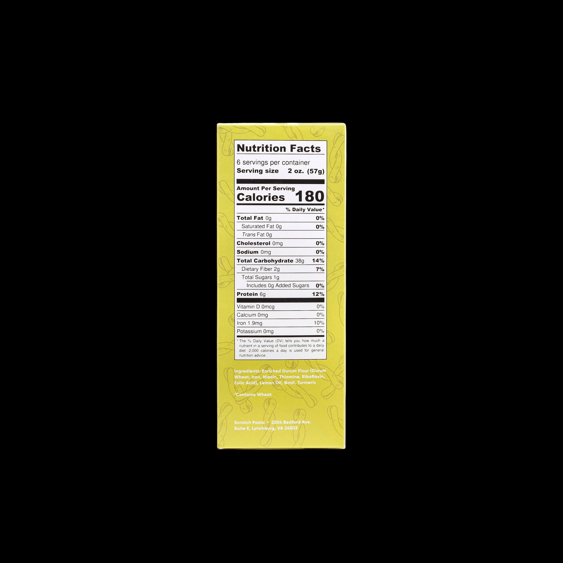 Ingredients: Semolina Flour, Water, Lemon Oil, Basil, and Turmeric Vegan | 12 oz. Bag
