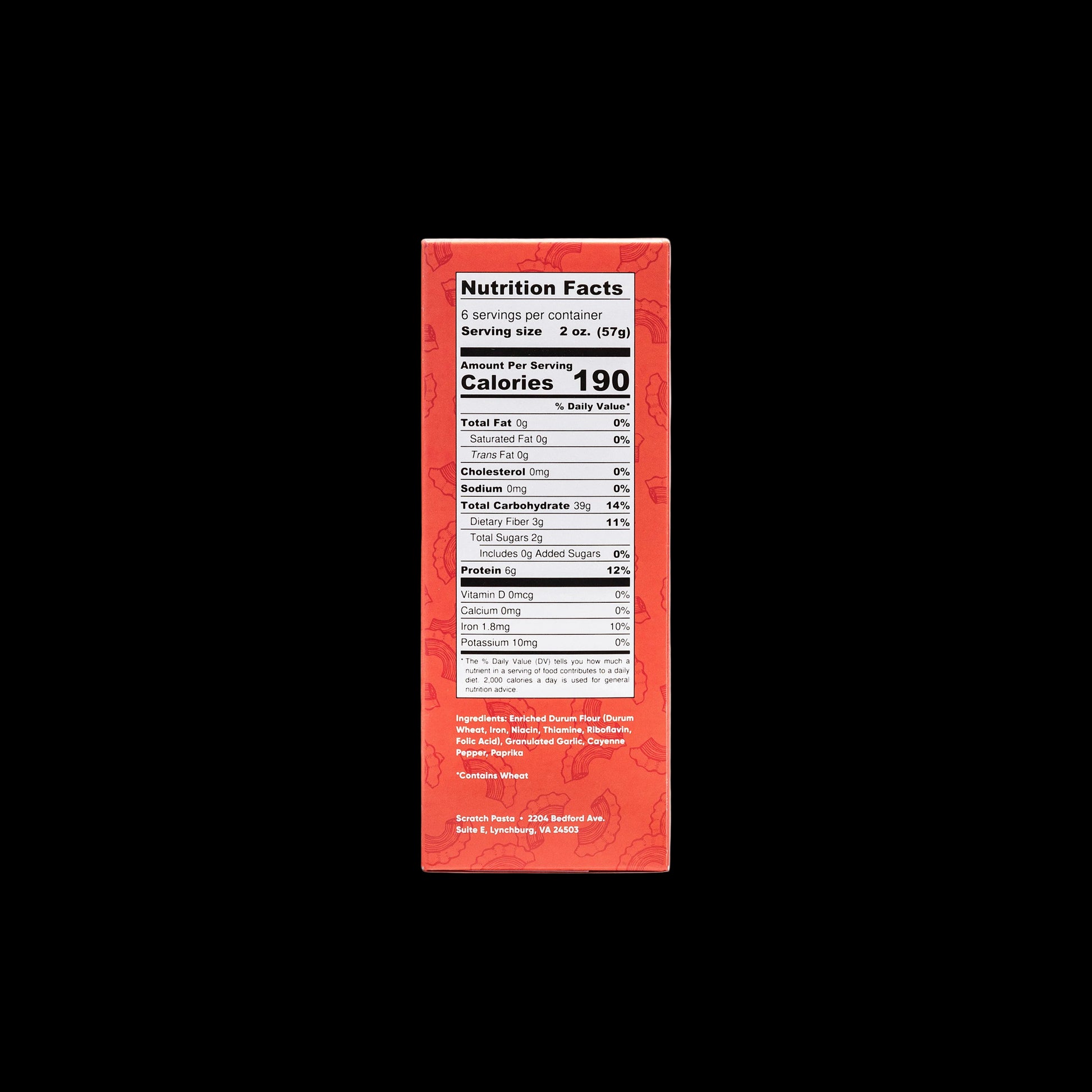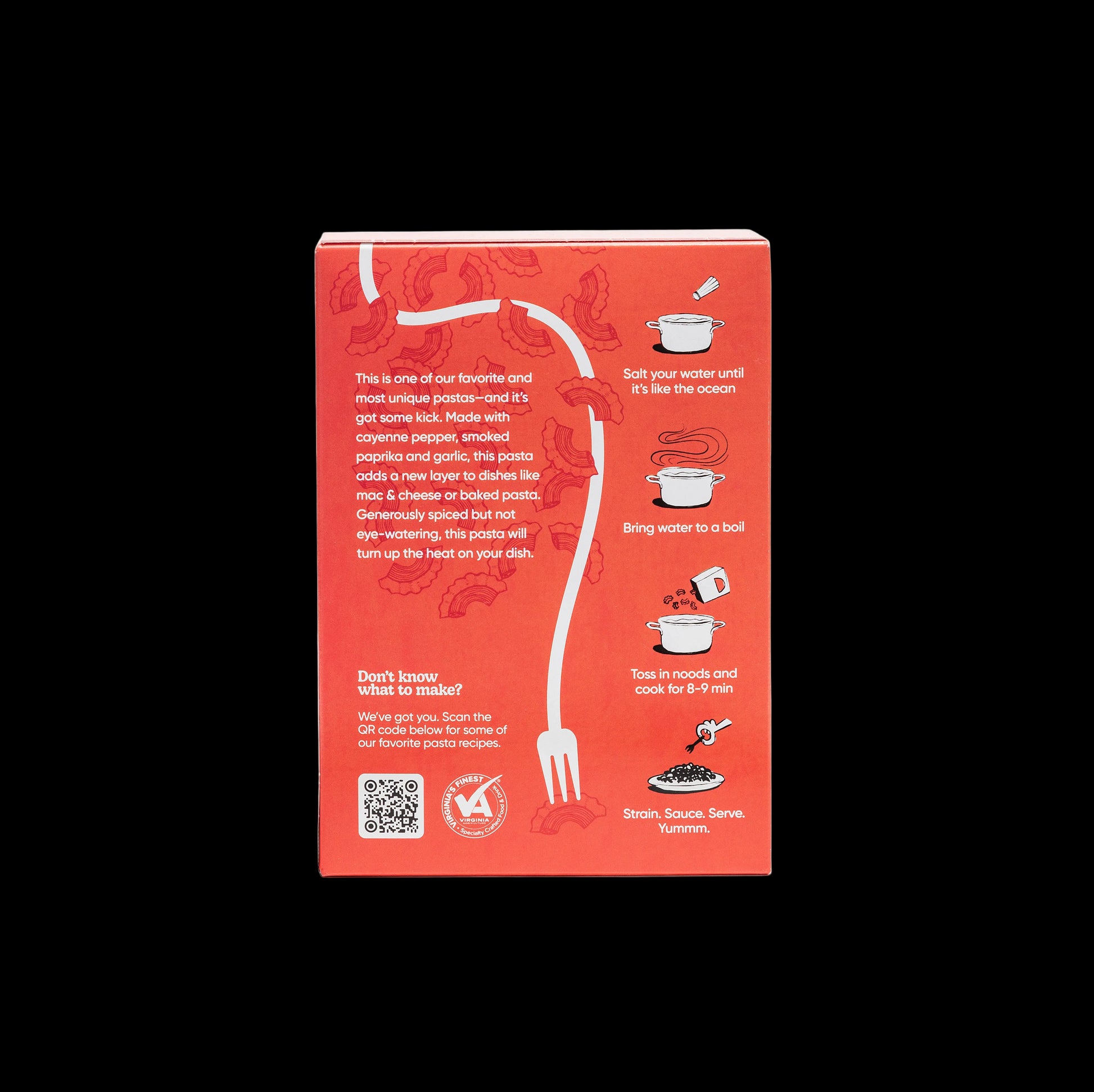 This is one of our favorite and most unique pastas—and it’s got some kick. Made with cayenne pepper, smoked paprika and granulated garlic, this pasta adds a new layer to dishes like mac & cheese or baked pasta. Generously spiced but not eye-watering, this pasta will turn up the heat on your dish.